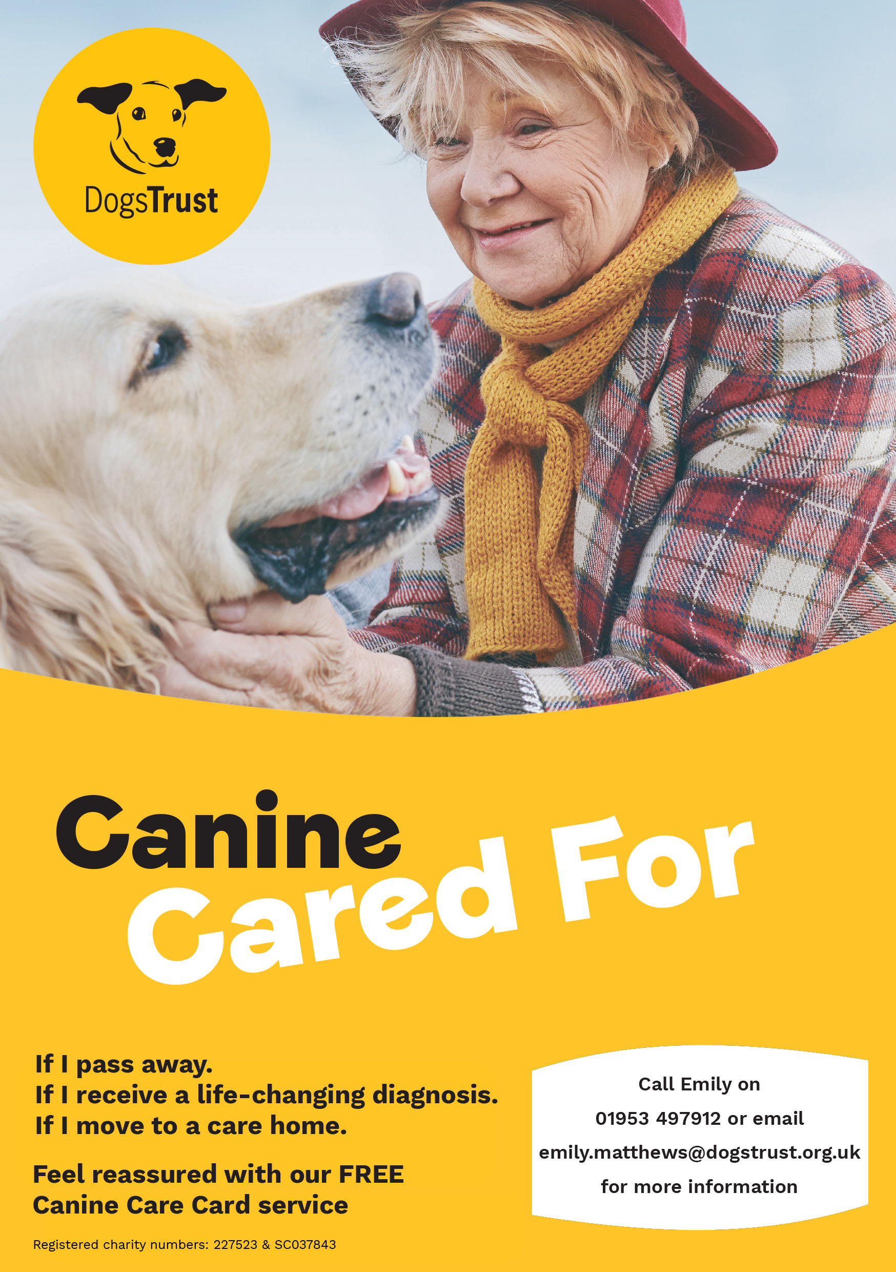 The Dogs Trust are running a free service supporting owners in the event that you may become seriously ill, pass away or have to move to a care home. The Dogs Turst will ensure your dog is well looked after and rehomed if the circumstances are required. For more information on the Canine Card Service visit The Dogs Trust website, alternatively contact Emily by phone: 01953 497912 or email.