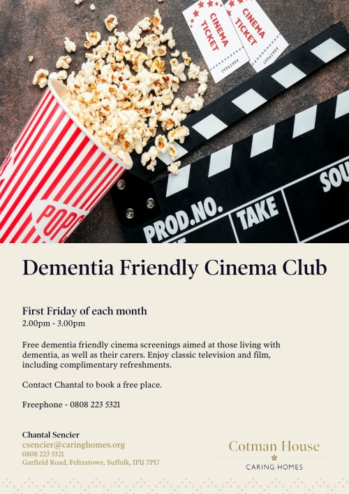 Free Dementia Friendly Cinema Club for those living with Dementia and their carers, where you can see classic television and film. The first Friday of the month from 2pm – 3pm at Cotman House, Garfield Road, Felixstowe, IP11 7PU. To book a place contact Chantal by phone: 0808 2235321 or email.