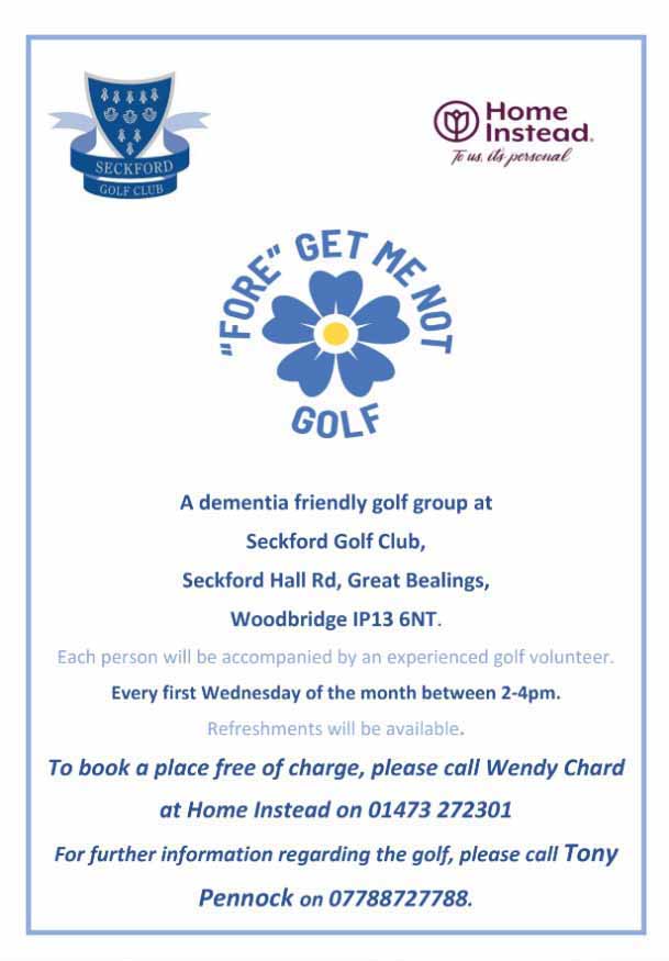 Taking place on the first Wednesday of the month Home Instead are running a Free ‘Dementia Friendly Golf Group located at Seckford Golf Club Seckford Hall Road, Great Bealings, Woodbridge, IP13 6NT. To book a place contact Wendy Chard on 01473 272301 and for more details on the golf contact Tony Pennock on 07788 727788
