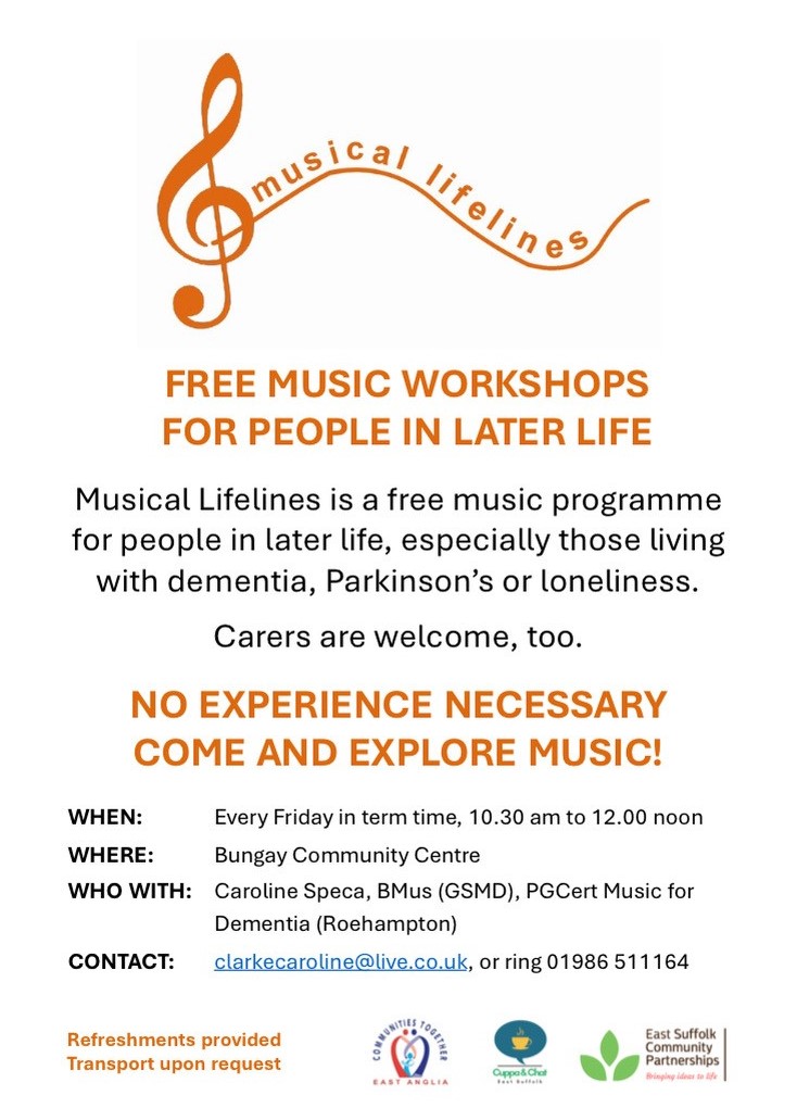 Musical Lifelines are free musical workshops for people later in life who are living with Dementia, Parkinson and loneliness. The workshops take place at Bungay Community Centre on Fridays during term time from 10.30am – 12pm. The sessions are open to Carers and refreshments are available. For more information contact Caroline on 01986 511 or email her.