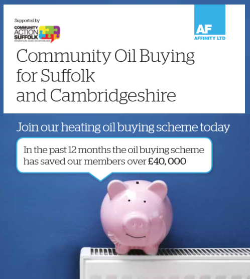 Community Action Suffolk have produced a leaflet to help the Suffolk and Cambridgeshire community oil bulk buying scheme in partnership with AF Affinity can help you reduce the high cost of your heating oil by bringing Suffolk and Cambridgeshire communities together and buying together. For more information click on the image below.