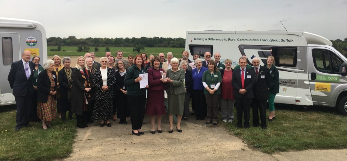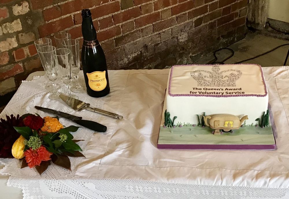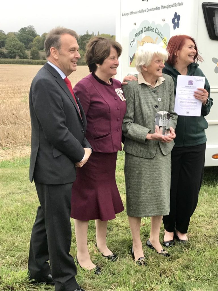 Yesterday marked another special occasion for the Rural Coffee Caravan as we were officially presented with the Queen’s Award for Voluntary Service, the highest award given to local Volunteer groups across the UK, recognising outstanding work in their communities. Over seventy people including staff, Volunteers, trustees and representatives from partner agencies gathered at Felsham Hall Barn, Bury St Edmunds, which we were kindly allowed to use by Mr. and Mrs. Michael Shallow. The barn itself looked magnificent with bunting hanging from the beams, beautiful fruit and flower table arrangements and exquisite music provided by Xenia and her harp!